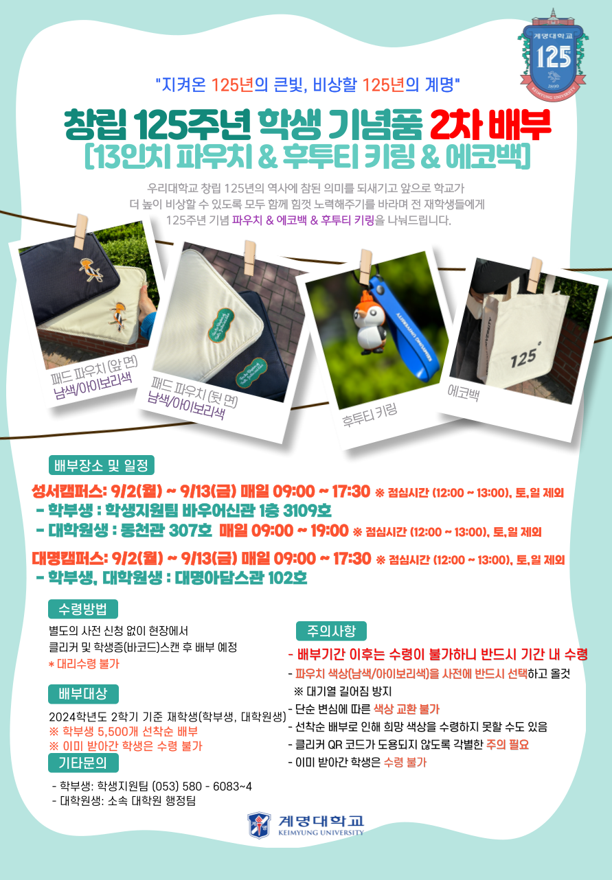 창립 125주년을 기념하여 파우치 세트(파우치, 후투티 키링, 에코백)를 제작 및 배부하였습니다.